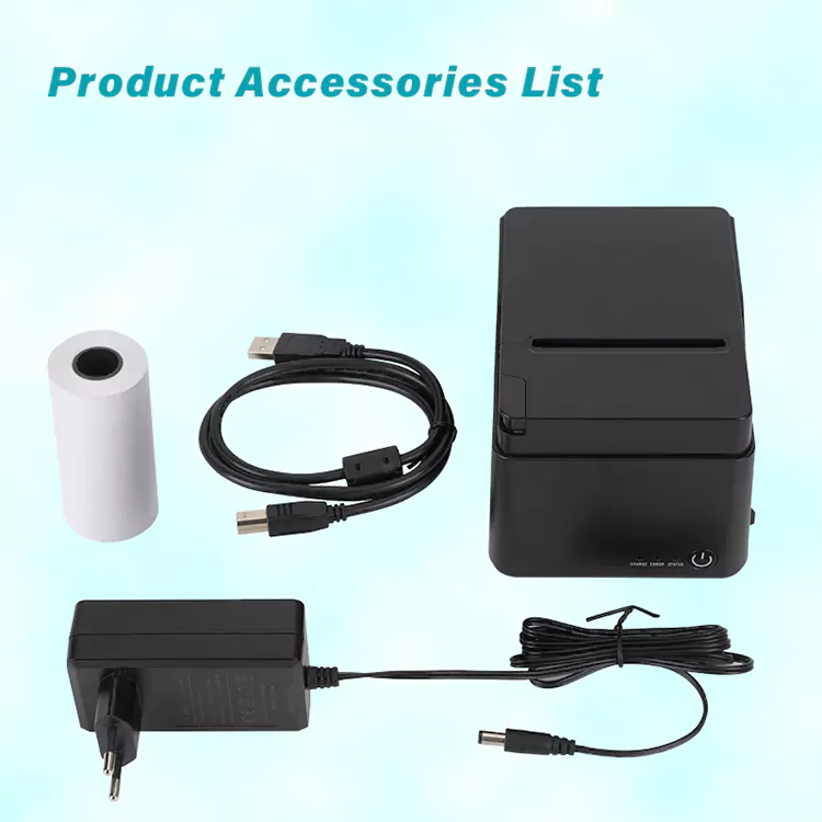 1.Package တွင် 80mm ပြေစာပရင်တာ၊ စက္ကူလိပ်၊ usb ကြိုး၊ လက်စွဲစာအုပ်၊ adapter။